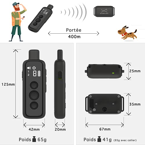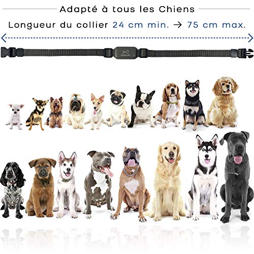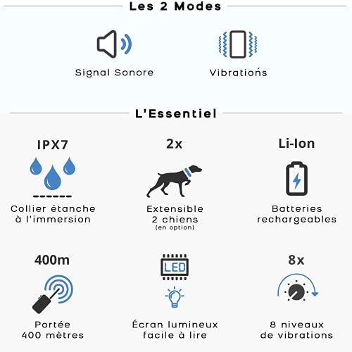 【 BETROUWBAAR EN EFFICIËNT 】Voor alle honden van +4,5 kg en Puppy’s van +6 maanden – Evolutionaire afstandsbediening voor 2 honden door eenvoudige toevoeging van een halsband – Bereik van 400 meter – Waterdichte halsband gecertificeerd IPX7 – CE-certificering – 2 jaar garantie