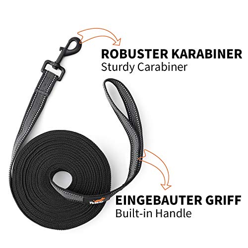 Scheurvast en slijtvast: gemaakt van hoogwaardig nylon en metalen karabijnhaak, is de trainingslijn weerbestendig en vrijwel onverwoestbaar. Geschikt voor elke hondengrootte.