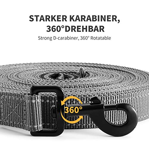 ★ Flexibele D-vormige karabijnhaak, comfortabele handgreep: de robuuste karabijnhaak in D-vorm bestaat uit een hoogwaardige zinklegering en de sleeplijn van 10 m voor honden kan zich tijdens veldtraining en lopen flexibel draaien. Het handvat van de lange hondenriem is bekleed met neopreen materiaal, dat comfortabel en zacht is, en je kunt je hond comfortabel controleren.