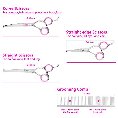 Specification: GEMEK hondenverzorging schaar set, 4CR roestvrij staal veiligheid ronde tip huisdier professionele verzorgingstool 5-delige set – rechte, gebogen, dunner wordende schaar en kam voor honden, katten en andere dieren
